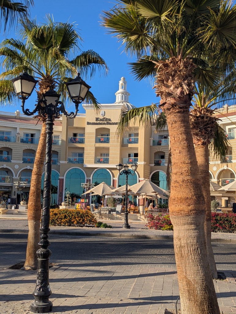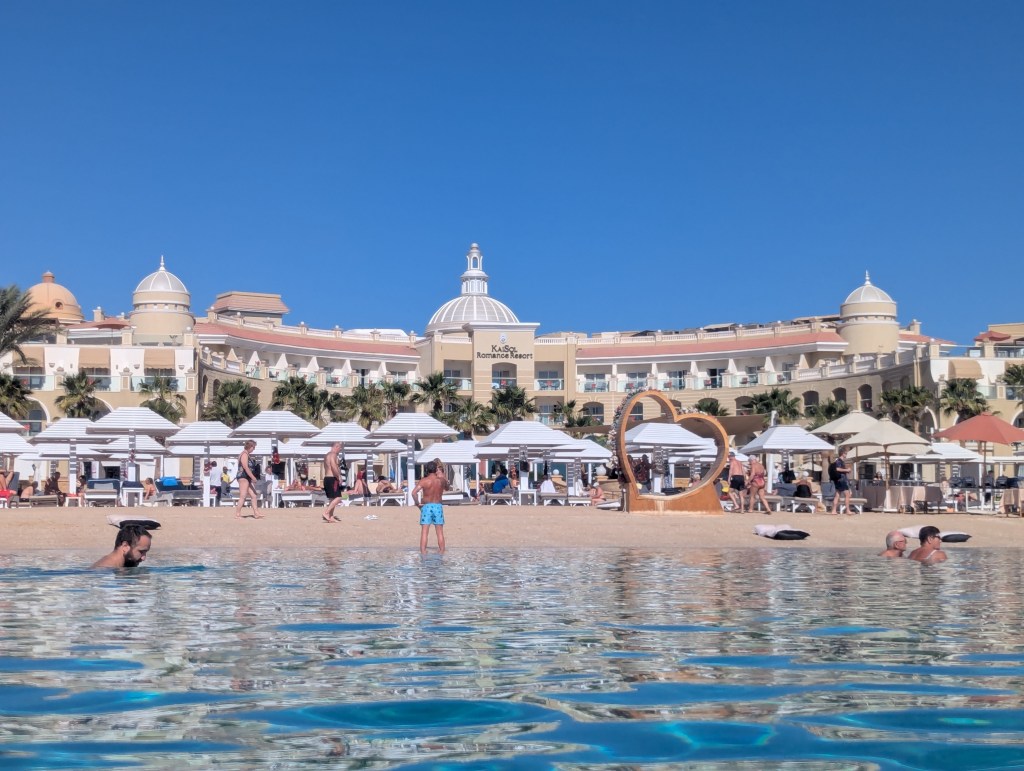 We stayed at Kai Sol Romance. We’d done a lot of research into all inclusive adult only holidays across Hurghada and neighbouring resorts and this one stood out as it didn’t have the “beach club scene” that many other adult only places had. We weren’t looking for that. It also had consistent good reviews for food, drink and service. The hotel was perfect for us. The beach was gorgeous, with plenty of sun loungers and crystal clear water.