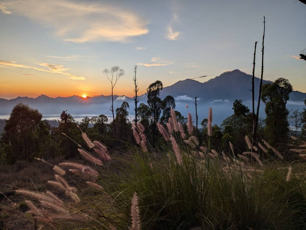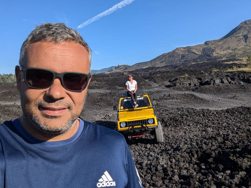 Mount Batur is an active volcano in northern Bali, about 1,717 meters high, with a crater lake at its base. Instead of hiking, we chose a jeep safari to explore the area — perfect for taking in the dramatic volcanic landscape. After sunrise and amazing views of the volcano, our driver took us to explore the black lava fields and black sand terrain, remnants of past eruptions. Absolutely unlike anything else in Bali.
