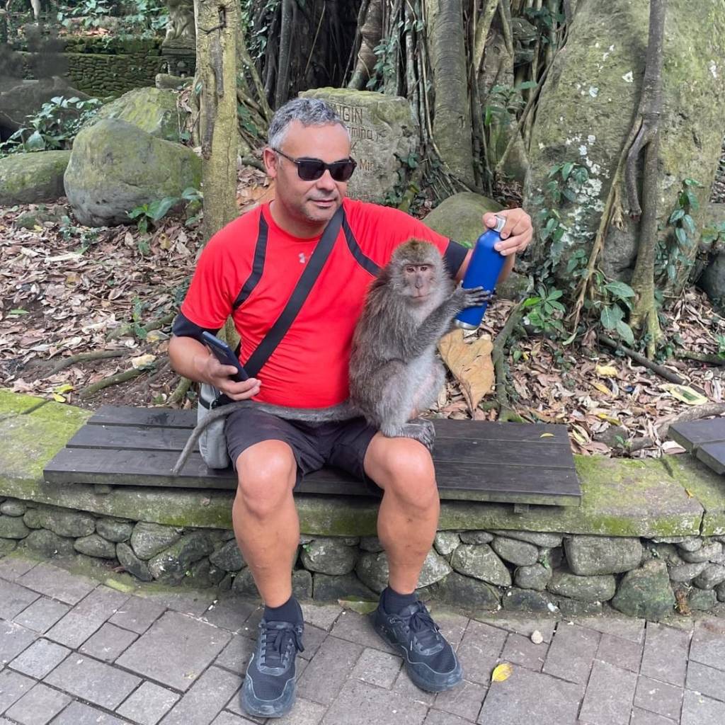 We had a short walk from our hotel to the Sacred Monkey Forest Sanctuary. There were monkeys everywhere, very clever, used to people, and ridiculously smart. The cheekiest moment was watching two monkeys work as a team to steal a girl’s water bottle right out of her hand. Later, another monkey was interested in Paul’s water bottle, hopping onto his knee and posing perfectly for a photo, a real character.