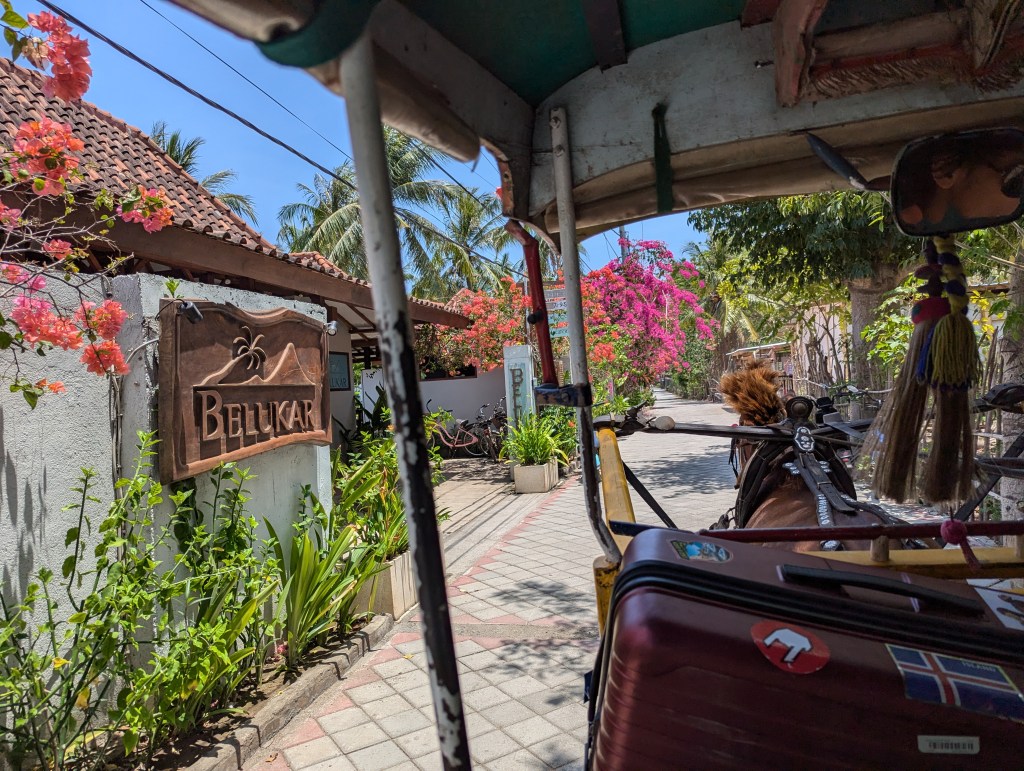 We took the Blue Water Express ferry to Gili Trawangan. From the harbor, we got a horse and cart to our hotel, which felt like stepping back in time.