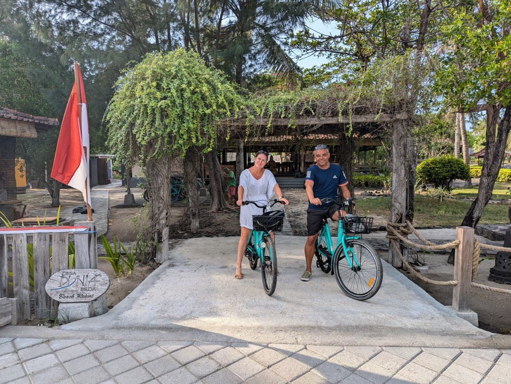 We started the morning with a cycle around Gili Trawangan, enjoying the quiet streets and island vibes. From our hotel restaurant table, we could see turtles swimming just off the coast.